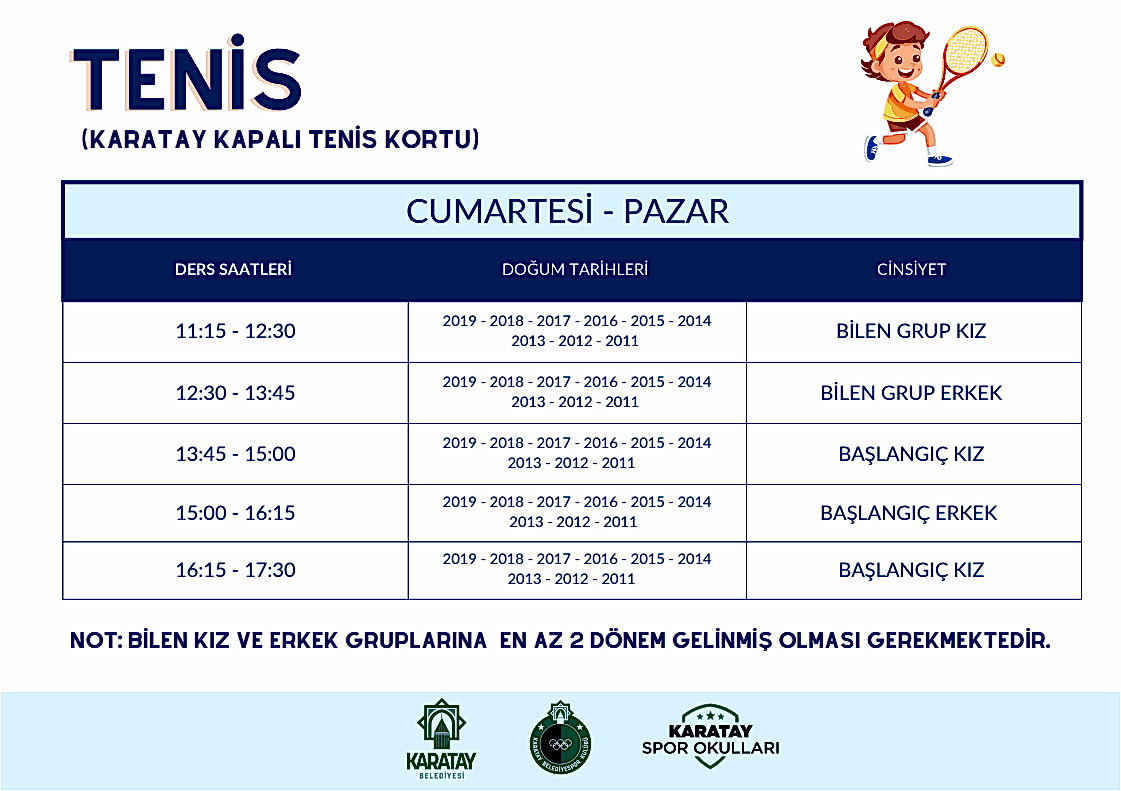 İnternet üzerinden ön kayıt oluşturan velilerimiz, kendilerine gönderilecek bilgilendirme mesajının ardından Karatay Tenis Kortu’na gelerek kesin kayıt işlemlerini gerçekleştireceklerdir. Kesin kayıt tarihi SMS yoluyla ayrıca bildirilecektir.